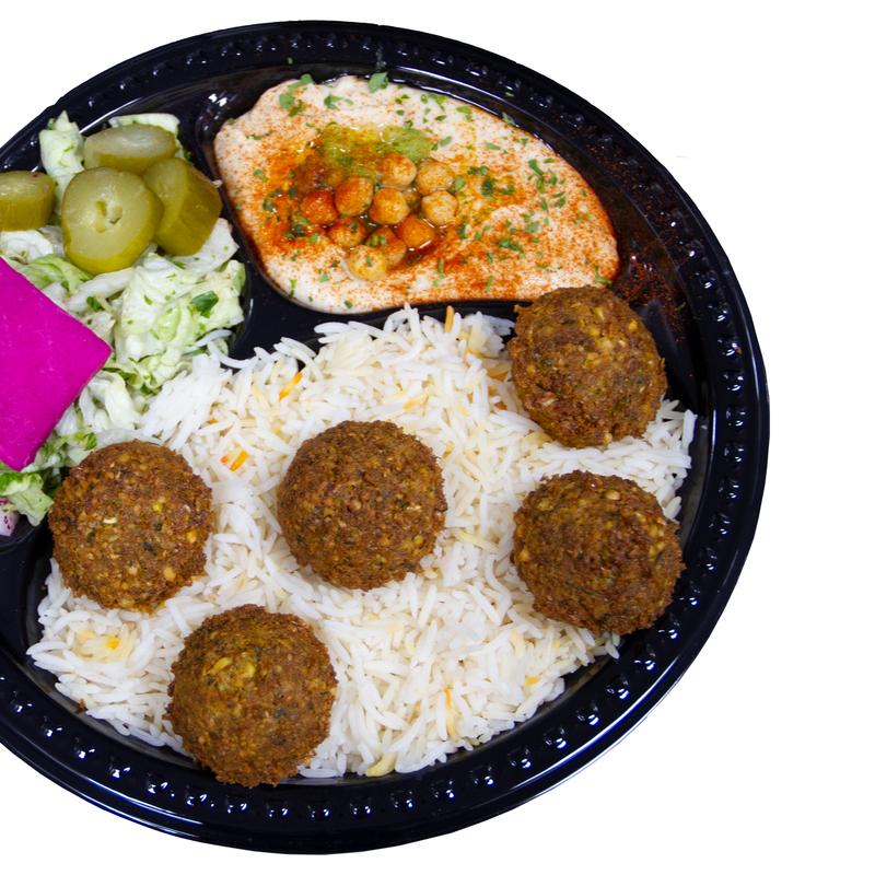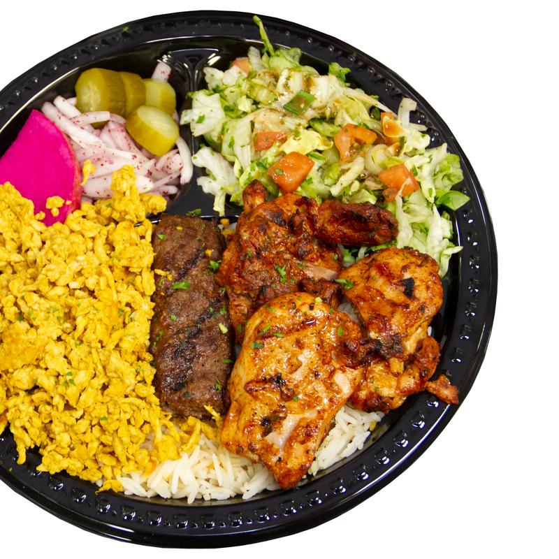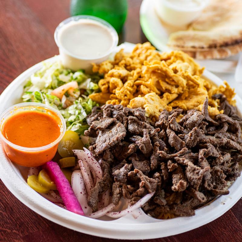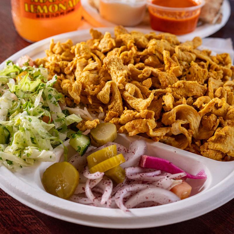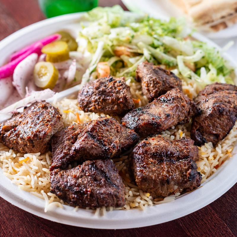 All entrées are served with basmati rice, pita bread, onions, lettuce, tomatoes, pickled beets, and pickles