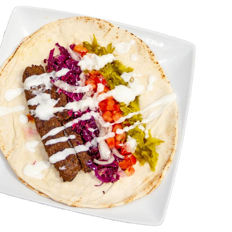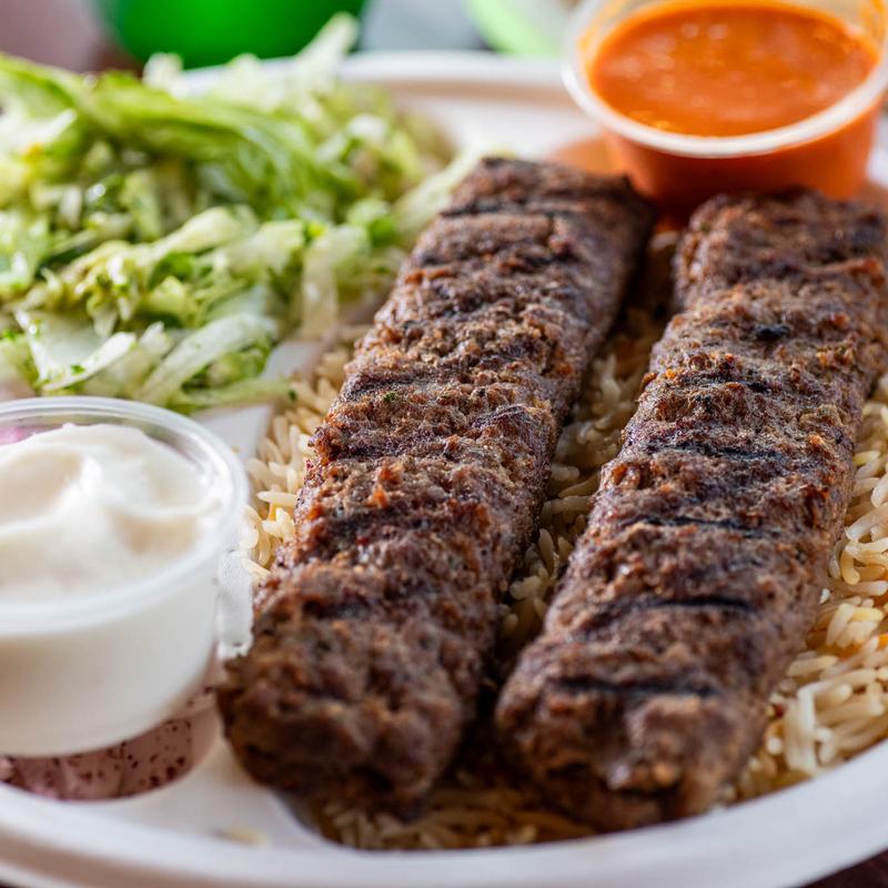 Ground beef on the skewer, blended with parsley, onions, and garlic.