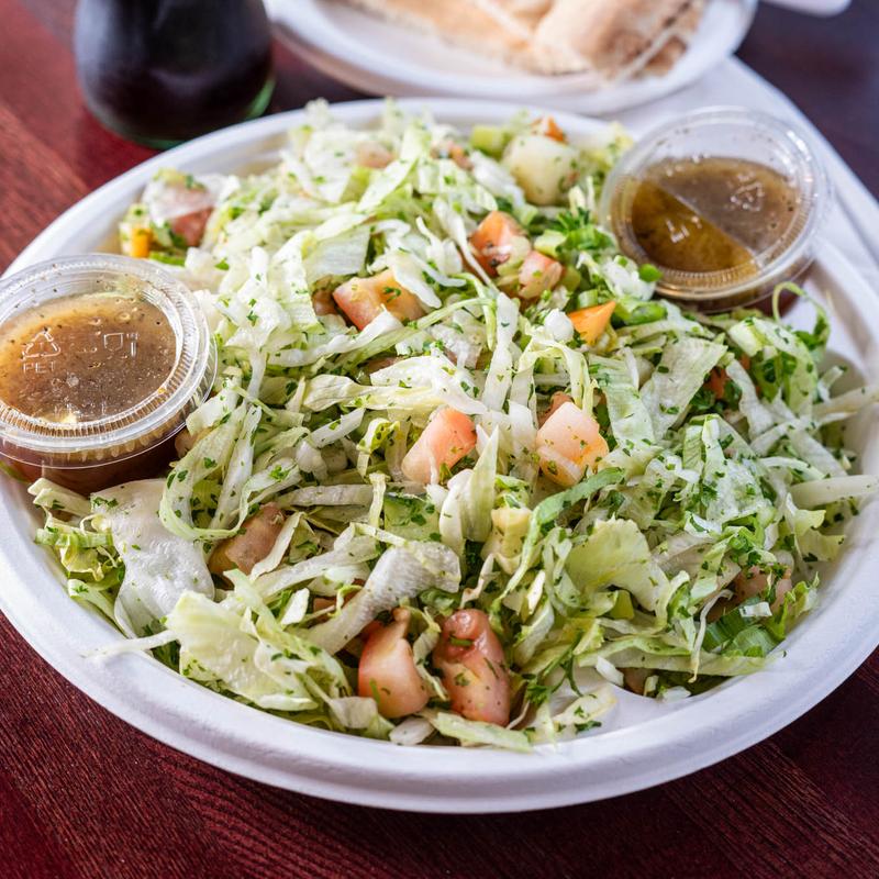 Garden salad, red cabbage, onions pickles, falafel, and scoop hummus.